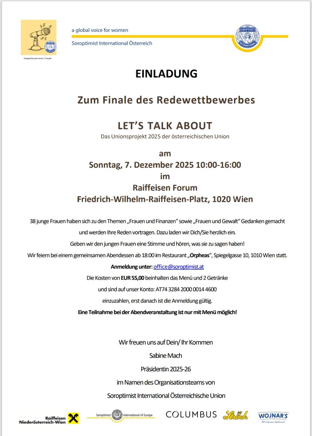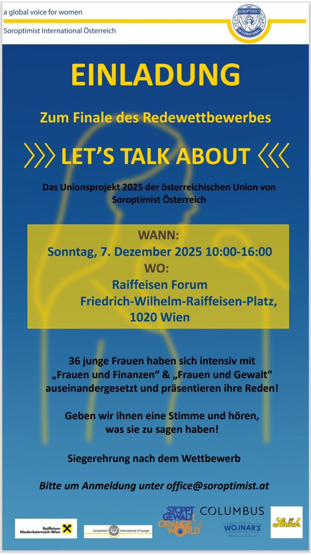 Am 7. Dezember fand in Wien das Finale des Redewettbewerbs „Let’s Talk About…“ der österreichischen Soroptimistinnen statt. 36 junge Frauen setzten sich mit den Themen „Frauen und Gewalt“ sowie „Frauen und Finanzen“ auseinander.